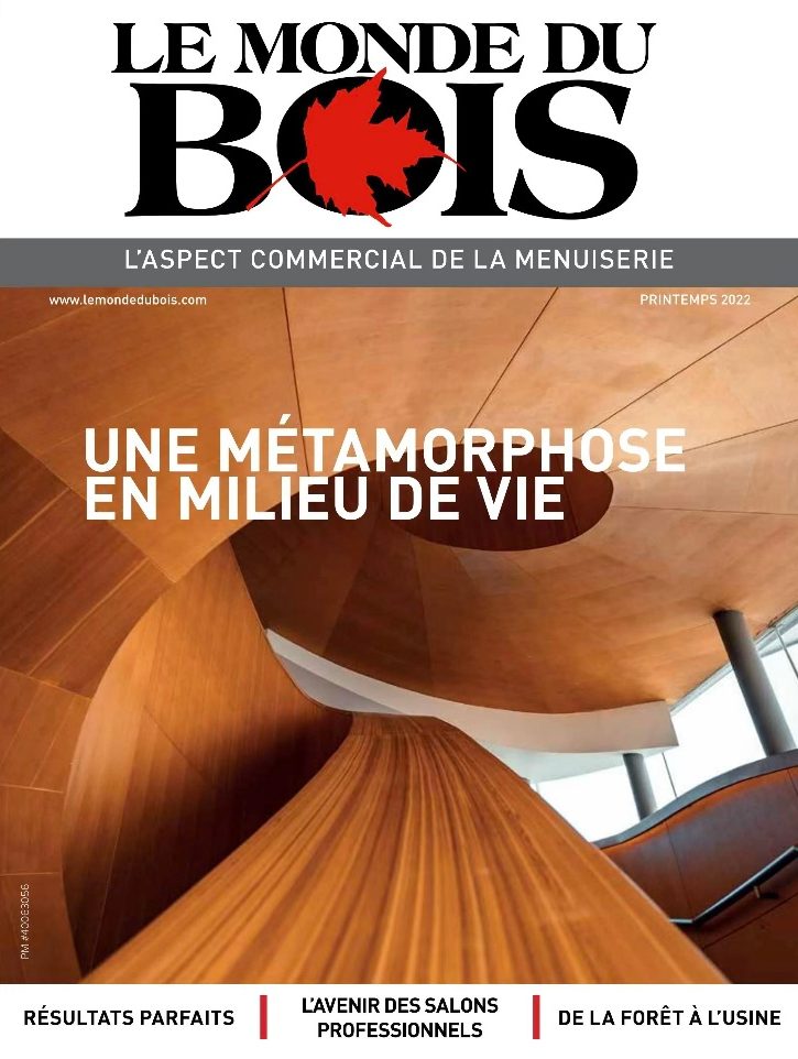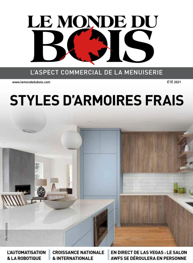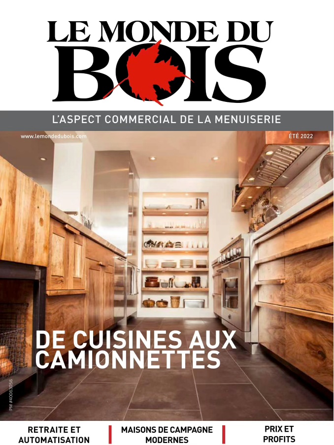 L’édition de l’été 2021 du magazine Le monde du bois : Styles d’armoires frais. Articles axés sur l’automatisation, les salons professionnels et la croissance internationale du secteur canadien des produits secondaires du bois.